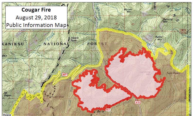 Located five miles east of Hope, the Cougar Fire is moving slowly through mostly creeping and smoldering, fire officials report. However, some tree torching and spotting is still possible. Fire managers are working on brushing out East Fork Road to create an additional fuel break, and earlier this week crews removed the protective wrapping on the SNOTEL site and Keeler Warming Hut northeast of the fire.