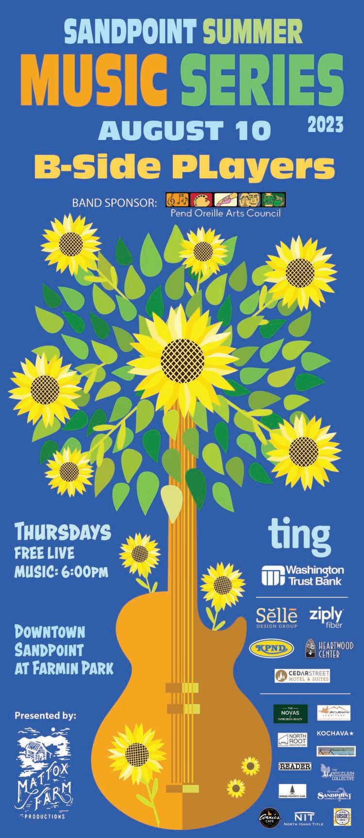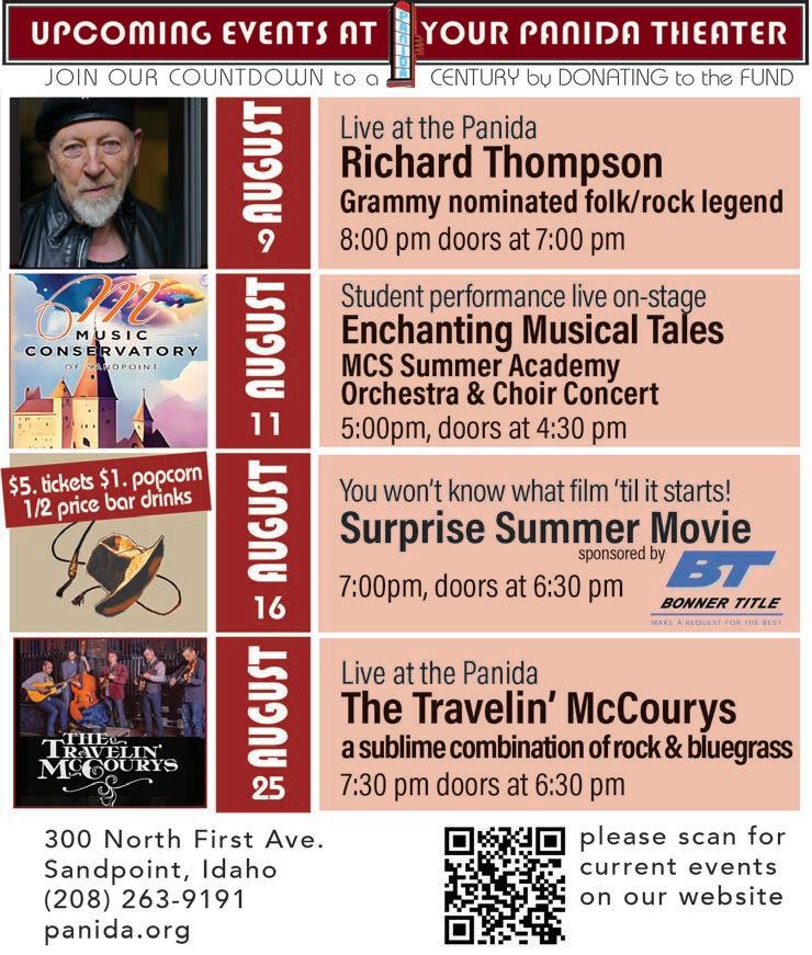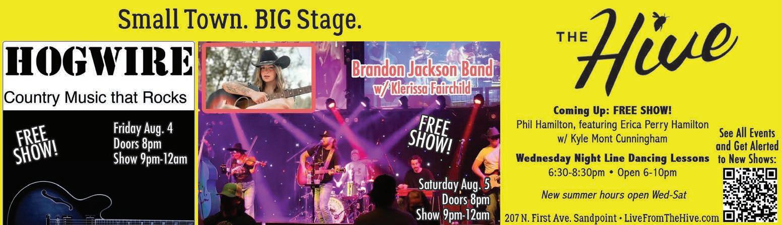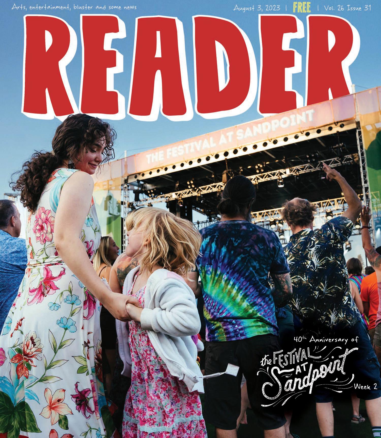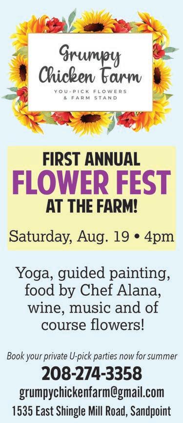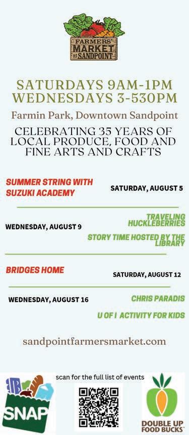 Special thanks to Racheal Baker for her always awesome photographs from the Festival. You can see Racheal’s photos on this week’s cover, as well as the special double-truck photo spread from Week 1 on Pages 12-13. We’ll also publish another double-truck of Festival photos from Week 2 in the Thursday, Aug. 10 edition of the Reader. Summer is kicking right along, so make sure you check out the packed events calendar on Page 18. The Sandpoint Summer Music Series is returning to Farmin Park for another free concert with the B-Side Players on Thursday, Aug. 10 and the Bonner County Fair is coming up Wednesday, Aug. 16-Saturday, Aug. 19, so mark your calendars.