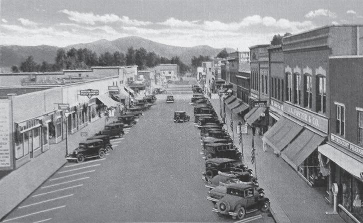 This is a tinted postcard from the 1930s. It is a view of First Avenue in Sandpoint, looking south.
