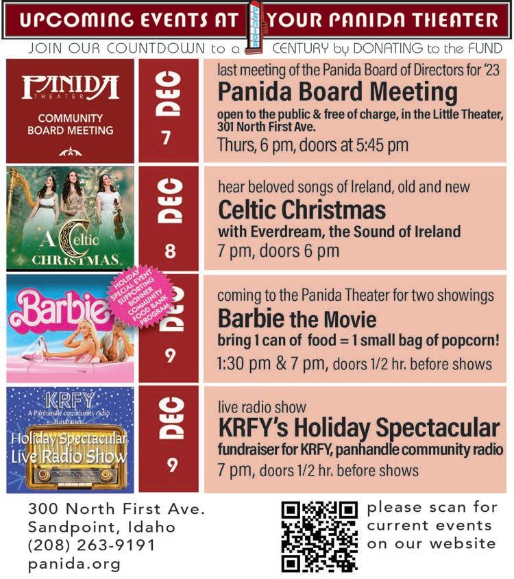 The Panida Theater will host two screenings of Barbie on Saturday, Dec. 9 at 1:30 p.m. and 7 p.m. to raise donations for the Bonner Community Food Bank. Attendees should bring cans or other non-perishable contributions for the food drive, and in exchange they’ll receive a ticket for a small bag of popcorn to snack on while getting caught up in this sensational blockbuster directed by Greta Gerwig.