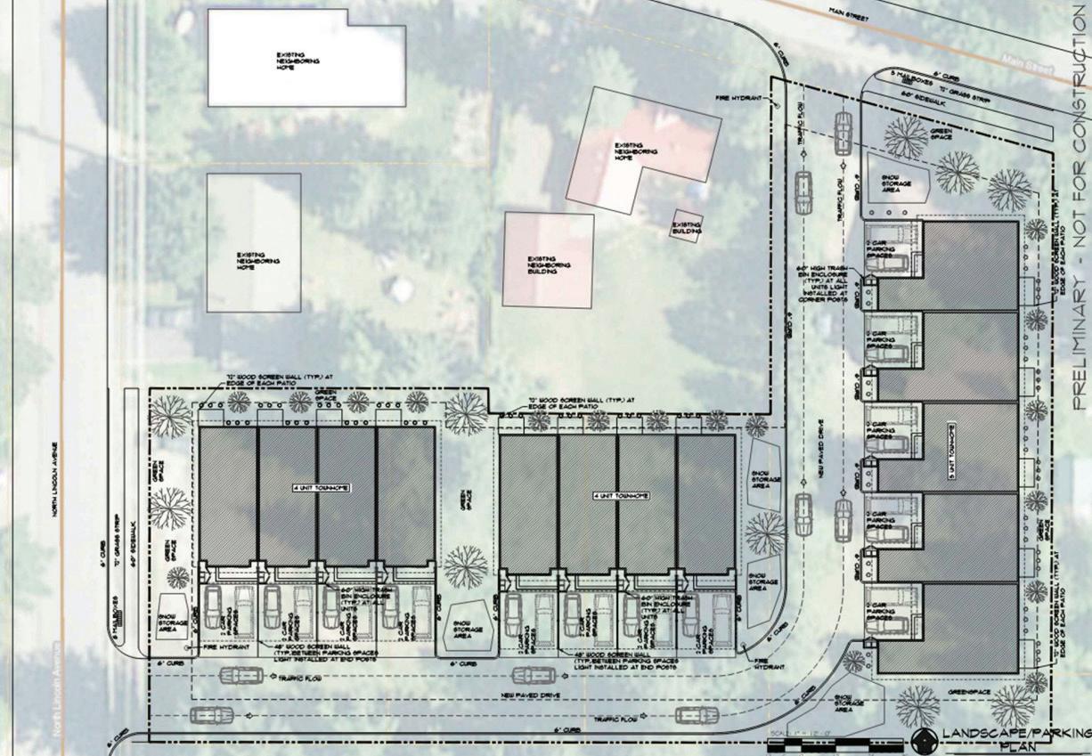 To make those parcels buildable, a private driveway would need to be constructed, effectively connecting Lincoln and Main through the center of the “L.” Doing so would open the way for construction of three separate buildings — two with four dwelling units each abutting the northern property line and one with five, larger units along the eastern boundary.