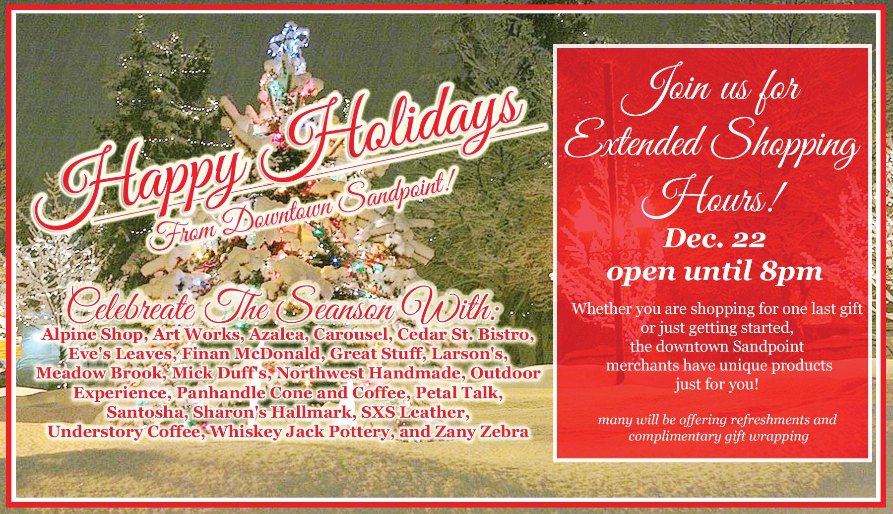 today. The raffle ends Dec. 21, so head down from 1-7 p.m. to pick up your raffle tickets. Christmas gift baskets are filled with treats from locals shops such as Pend d’Oreille Winery, Image Maker, MickDuff’s Brewing Co., Trinity at City Beach and Eichardt’s Pub.