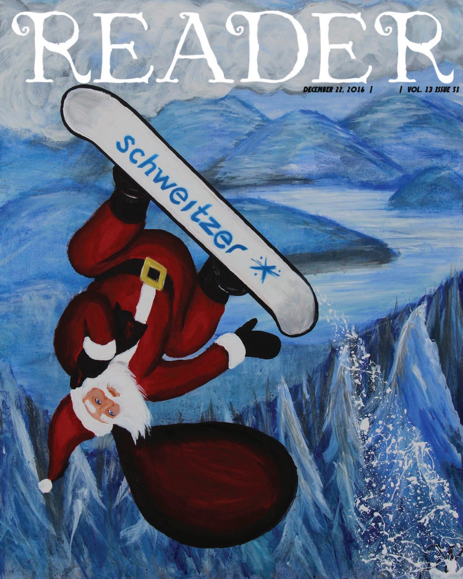 Jodi Rawson painted this week’s special Christmas cover, featuring Santa Claus catching some serious air at Schweitzer. Jodi has been a contributor for the Reader since the beginning and we appreciate her input.