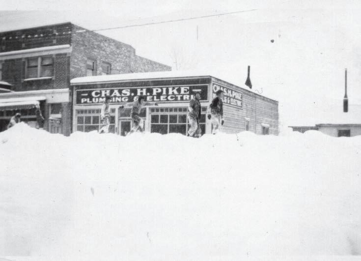 The Charles H. Pike Plumbing & Electric store at 210 Cedar Street with mounds of fresh snow out front. There are a few children walking along the top of the snow.