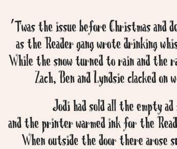 The Sandpoint Reader is a weekly publication owned and operated by Ben Olson and Keokee. It is devoted to the arts, entertainment, politics and lifestyle in and around Sandpoint, Idaho. We hope to provide a quality alternative by offering honest, in-depth reporting that reflects the intelligence and interests of our diverse and growing community. The Reader is printed on recycled paper using soy-based ink. Leftover copies are collected and recycled weekly, or burned in massive bonfires to appease the gods of journalism. Free to all, limit two copies per person.