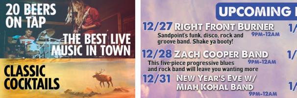 Schweitzer Mountain Resort is also hosting a number of New Year’s Eve parties, but the tickets are sold out. However, as the event organizers point out, “don’t panic.” Chimney Rock is still accepting reservations, Gourmandie is open until 7 p.m. — “but likely a little later” — and Pucci’s Pub and the Powder Hound will be admitting revelers into the evening. Get more info at schweitzer.com/event/newyears-eve-parties.