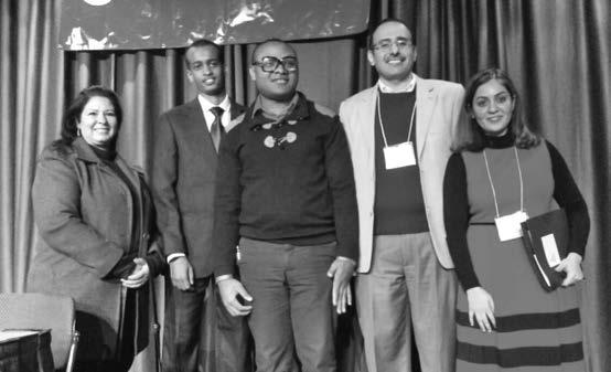 Top: Fidel Nshombo, a refugee from the Congo, has published two books of poetry. Middle: The refugee panel (left to right): Rafah Al Khafaji from Iraq has a PhD in Mechanical Engineering,