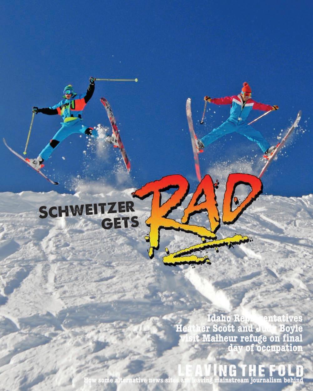 This week’s cover photo is from Schweitzer Mountain Resort. The photo features Sean Mirus and Sean Briggs decked out in their finest neon gear, airing off the cornice on C-Chute in 2013.