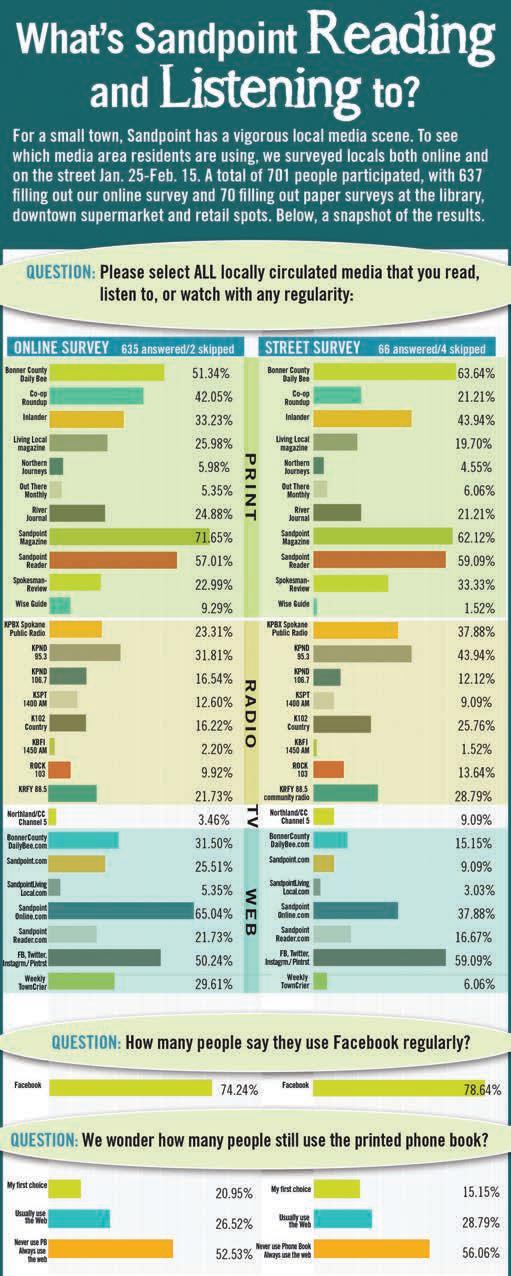 We were very pleased to see this year’s results. After only a year back in publication, the Reader placed among the top three most read publications in Sandpoint. Of the 637 people who responded online, 57 percent said they read the Reader. The street surveys of 66 people showed that 59 percent read the Reader. In comparison, only 25 percent of online respondents and 19 percent of street surveys said they read Sandpoint Living Local. What does that mean? If you’re spending money on advertising for your business, the best bang for your buck is in a publication that gets read by more people.