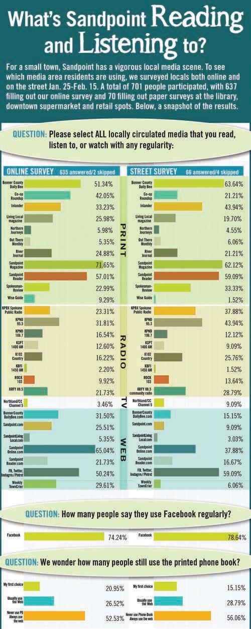 The Sandpoint Reader is a weekly publication owned and operated by Ben Olson and Keokee. It is devoted to the arts, entertainment, politics and lifestyle in and around Sandpoint, Idaho. We hope to provide a quality alternative by offering honest, in-depth reporting that reflects the intelligence and interests of our diverse and growing community