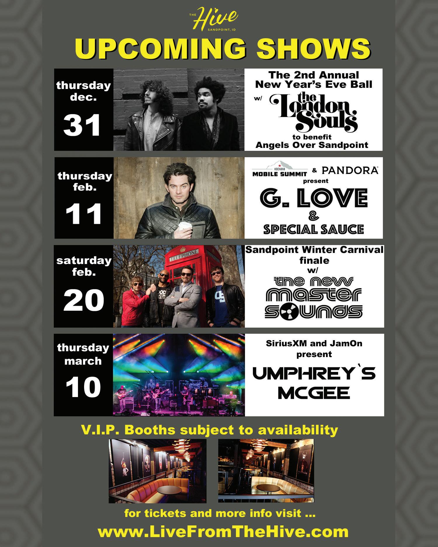 This rock duo has been making a huge splash on the scene since their formation in 2008, with music that reminds you of Led Zeppelin, Cream and the White Stripes. Not only is the music great, but the venue is guaranteed to please with a great party atmosphere. The best part is, the show is a fundraiser for the Angels Over Sandpoint. Tickets $40, with VIP booths available. The doors open at 9 p.m. and the show starts at 10 p.m. Check out www.LiveFromTheHive.com for more information.
