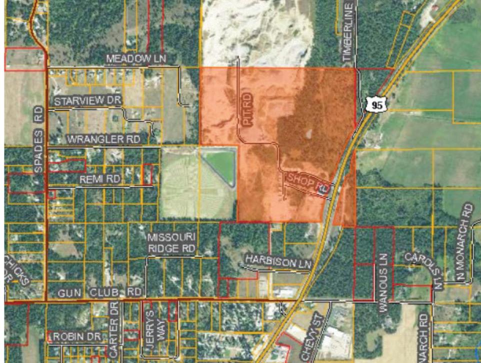 An aerial view of the location of the proposed batch plant. The red portion indicates the area where the conditional use permit would apply. Image courtesy of the Bonner County Planning and Zoning sta report on the proposed permit.