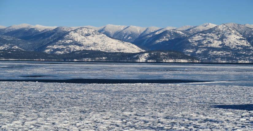 • Lake Pend Oreille as seen from the Windbag Jetty. There is a good amount of ice that extends hundreds of yards into the lake.