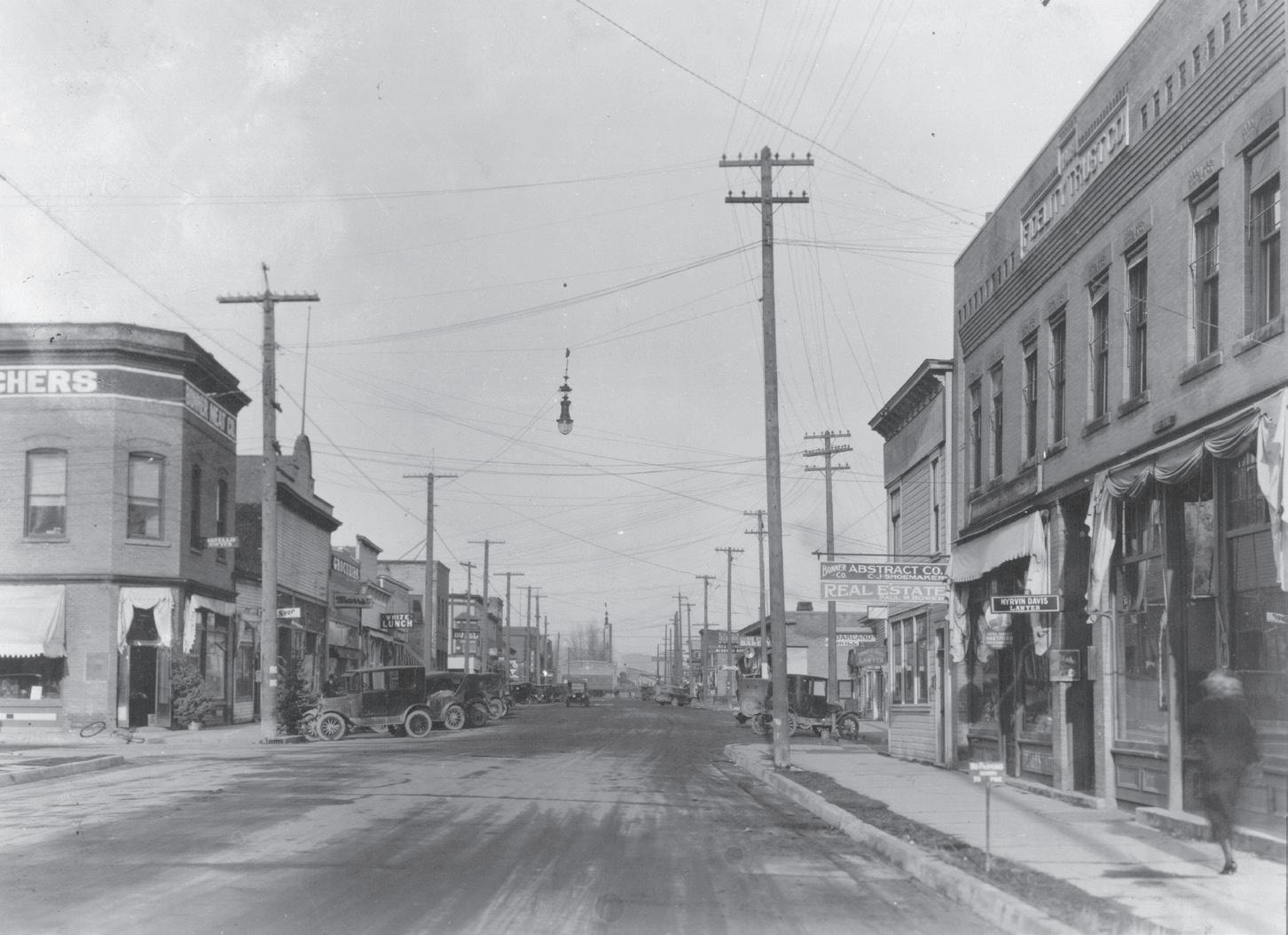 Looking north on First Avenue from just south of Pine Street. The NW corner of the intersection was Bonner Meat Company in the Bistline Building. On the right is the Fidelity Trust Building with a sign for Myrvin Davis at the Lawyer and Bonner County Abstract Company. The City Bakery is in the middle distance on the right.
