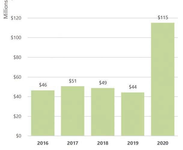 A graph showing the sharp increase in aggregate yearly household income due to net migration in Bonner County, which rose from $44 million in 2019 to a whopping $155 million in 2020. Source for data: Internal Revenue Service. Graph courtesy Leland Consulting Group.