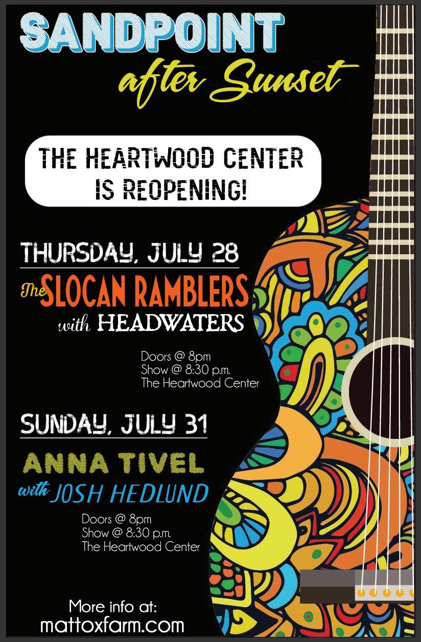 Also, Mattox Farm Productions is reopening the Heartwood Center under the direction of Robb Talbott, and they have a couple of great shows coming up, including the Slocan Ramblers with Headwaters on Thursday, July 28 and Anna Tivel playing with Sandpoint’s own Josh Hedlund on Sunday, July 31.