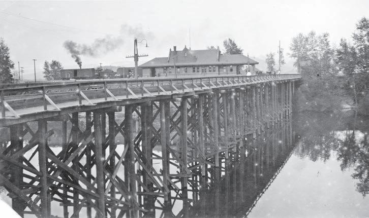 The Northern Pacific depot on Sandpoint, with Cedar St. Bridge in the foreground. The smoke you see is from a passing steam engine behind the boxcars to the left of the depot.