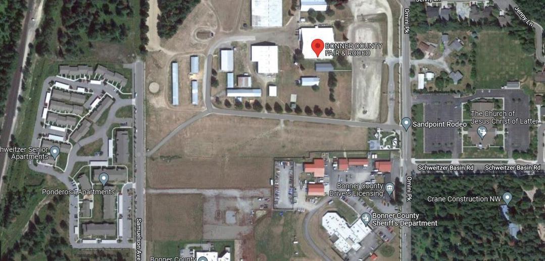An aerial view of the Bonner County Fairgrounds and the Bonner County Sheriff’s complex. A portion of the county-owned land between the two facilities could become home to the fairgrounds RV park expansion. Image courtesy Google.