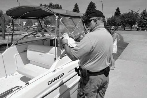 A pair of kayakers dock at City Beach. Ahrens gives them a once-over and recommends they purchase and display an Idaho Invasive Species Fund sticker. A requirement of for all motorized and non-motorized boats, the sticker program is one line of defense in the fight against invasive species. A true nightmare for ecologists, menaces like eurasian watermilfoil, flowering rush, curly leaf pondweed and quagga and zebra mussels spread like wildfire and can quickly turn a pristine lake or healthy fishery into an environmental wasteland if uncontrolled.