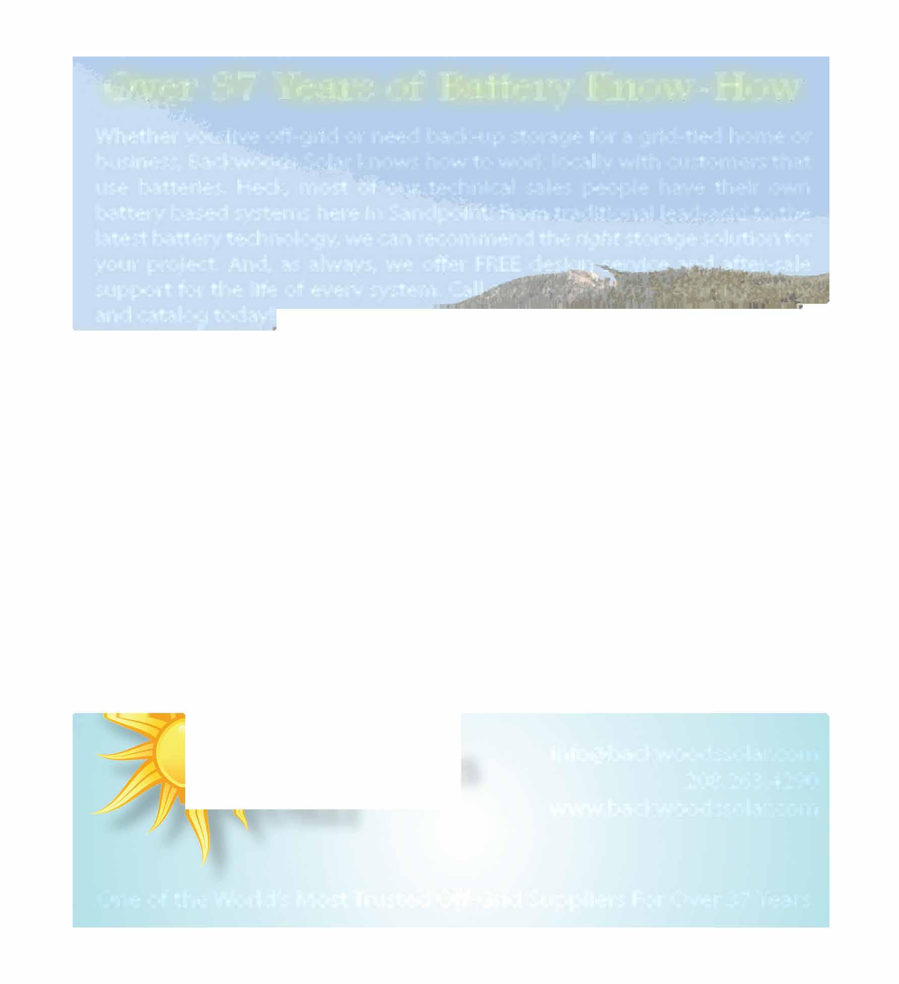 Whether you live off-grid or need back-up storage for a grid-tied home or business, Backwoods Solar knows how to worklocally with customers that use batteries. Heck, most of our technical sales people have their own battery based systems here in Sandpoint. From traditional lead-acid to the latest batterytechnology, wecanrecommendthe rightstoragesolutionfor your project. And, as always, we offer FREE design service and after-sale support for the life of every system. Call and request your planl'}ing 9uiQe and catalog today!