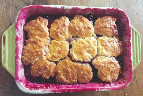 In a large bowl, toss the blueberries and rhubarb with the sugar and tapioca until evenly coated, sprinkle juice and zest over top and toss again. Set aside for up to an hour. Then, pour the lling in a well buttered baking dish (approx 9x11x2). Preheat the oven to 400°F. Make the dough by whisking our, sugar, baking powder and salt in a large bowl. Cut in the butter using a pastry cutter or your ngers until you have coarse crumbs. Add the cream and gently mix just until it forms a sticky dough; do not over mix.Place large spoonfuls of dough over the fruit in the baking dish.