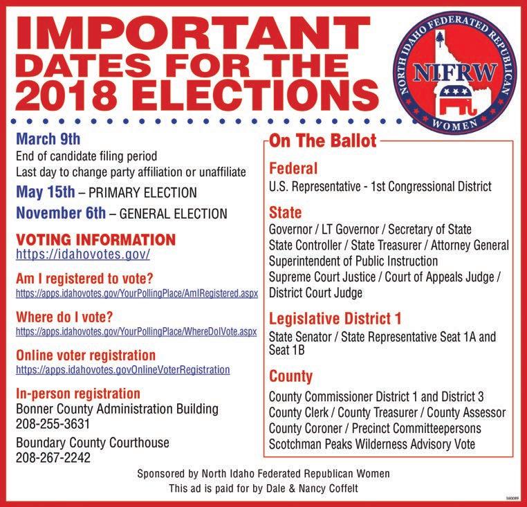 In lieu of my usual rambling here, I thought I’d share this election information sponsored by the North Idaho Federated Republican Women and Dale and Nancy Coffelt. The last date to file or change party affiliation is March 9. -Ben Olson, Publisher