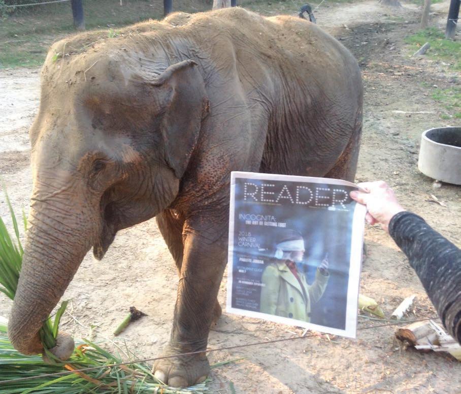 Ken and Lisa Larson sent in this photo of the Reader from their travels in Thailand. Oh yeah, and there’s an elephant, too. His name is Pai Lin, and he’s 72 years old. Cool.