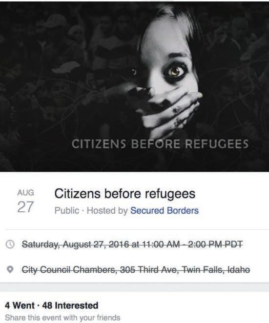 in ammatory post by Secured Borders that invited citizens of Twin Falls, Idaho, to a meeting about Muslim refugees. Courtesy Facebook.