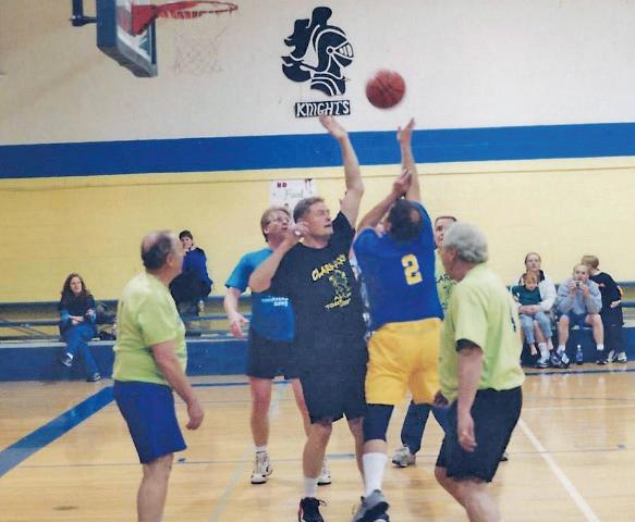 Paul Tallman, center, goes up for the block during an Alumni Tournament “old timer’s” game in the early 2000s. Photo courtesy CFHS Alumni Tournament Facebook page.