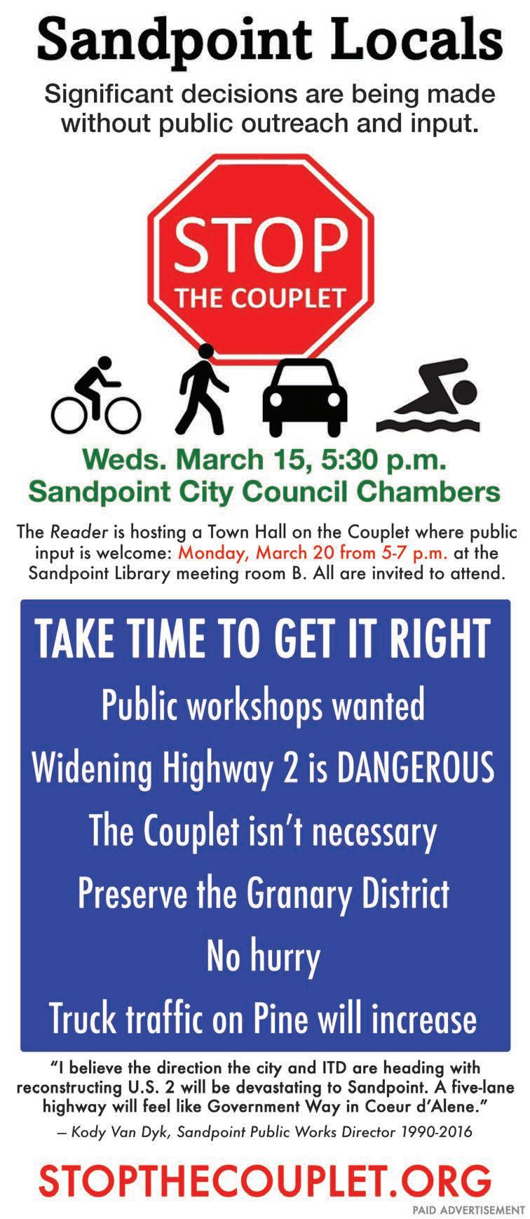I’d like to invite you all to attend an open town hall meeting on Monday, March 20 from 5-7 p.m. at the Sandpoint Library community meeting room B.The Reader is hosting this town hall to give the public a chance to discuss and hear information about the Couplet plan that has been in the news in recent weeks. We’ve invited some former city staff members to give a presentation on their experience with the Curve plan which Sandpoint City Council rejected over a decade ago, as well as detailed discussions of how the Couplet would affect Sandpoint. We’ll also distribute surveys to those in attendance so our voices will be heard.