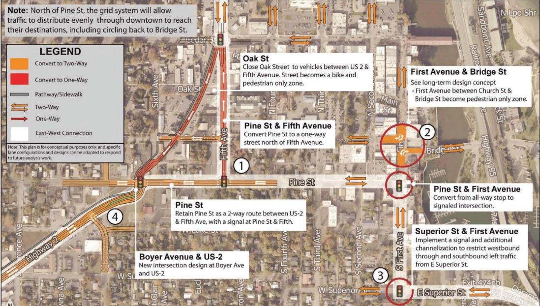 city needs to use the property. According to the design, Pine Street would remain two-way from U.S. 2 to Fifth Avenue, with a signal placed at Pine and Fifth. Northbound traffic would travel on Fifth, which would be converted to one-way. Southbound traffic accessing U.S. 2 would need to exit the intersection at Fifth and Cedar and take a new two-lane, one-way route — one half of the “Couplet” — travel-