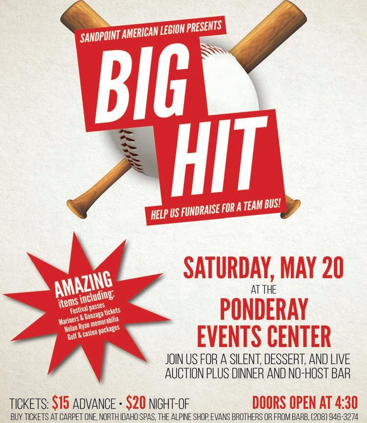 Next, I want to remind everyone that there is an important election coming up. The Lake Pend Oreille School District is electing new school board trustees on Tuesday, May 16. If you think this is a humdrum stay-at-home-instead-ofvote election, you’re wrong. It’s up to you, the voter, to make sure we are adequately taking care of our next generation, and these school board trustees are on the front lines of policy moving forward. I’m not going to tell anyone who to vote for, but I will say that I will always support our students finding their full potential in life. It’s amazing how one small connection with a good teacher or a well-placed class, or a conversation with a guidance counselor can start a chain reaction ending up with a student achieving more than we could ever have dreamed to achieve for ourselves. So please vote Tuesday, May 16, from 8 a.m. to 8 p.m. at various polling places. Check the Bonner County election site if you don’t know where to vote.
