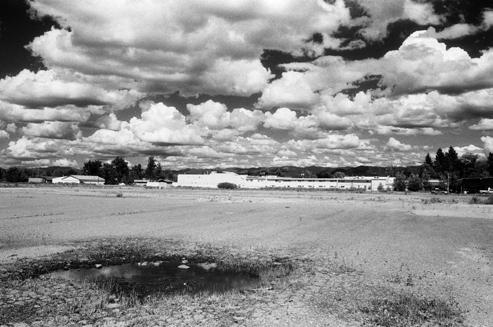 Looking east from the lot on the corner of Boyer Ave. and Larch St., once the home of the Louisiana-Pacific poleyard and sawmill. The low white building in the distance is the back side of the Quality Inn on Fifth Ave.