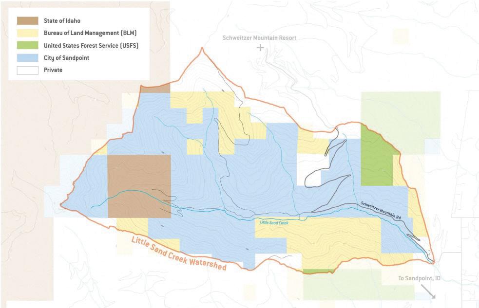Encompassing almost 7,413 acres, the watershed is located south of Schweitzer Ski Resort and divided in ownership between the resort, Bureau of Land Management, U.S. Forest Service, Idaho Department of Lands and Sandpoint — the city being the majority landholder with 3,921 acres.