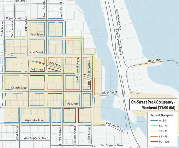 using on-street observation and drone flyovers, the study sought to capture a snapshot of the amount and length of parking occupancy throughout the downtown area on a peak-season Thursday and Saturday in July. The resulting data found that while on-street parking throughout downtown is generally less than the 85% benchmark, there are pockets where the crunch for available spaces rises to 100% and higher during peak times — particularly along First Avenue, at the downtown waterfront and in the area surrounding Bonner General Health. On-street parking around Farmin Park is similarly hard to come by during weekend hours, presumably due to traffic fueled by the Farmers’ Market.