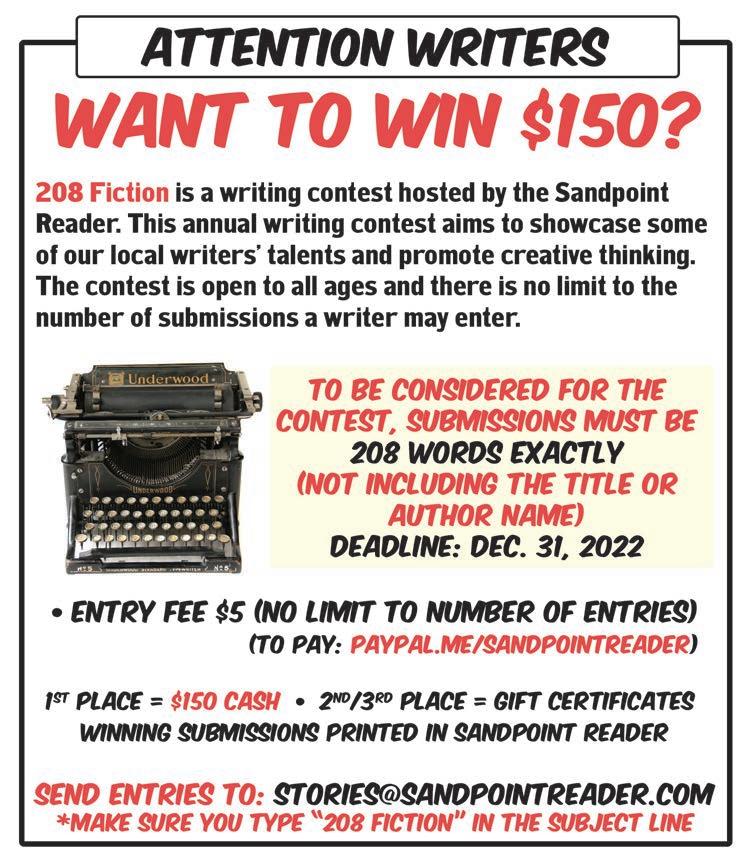 Finally, we’re bringing back the 208 Fiction writing contest for the holidays. See the ad on Page 13 for more detailed information, but in a nutshell, writers submit short stories that are exactly 208 words long and judges pick a winner, who earns $150! That’s better than a turkey leg in the face. Write on.