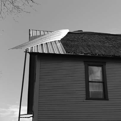 An apartment building on Pine Street lost a dozen sheet metal roof panels, sending them flying into a power line. The block was still without power as of Wednesday evening.