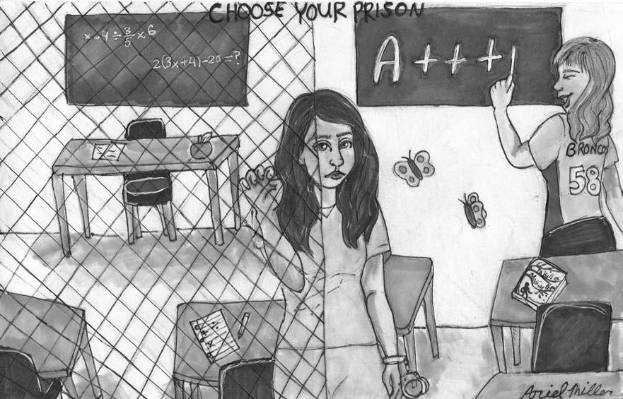 They ooze through the doorway, one after the other after the other after the other, blocking and bumbling, flowing and skipping. They laugh, they mumble: smirk, sneer, gleam, sparkle. The kids. The children, darlings, sweet bumble bees, jerks, jocks, nerds, the wiser-than-thou-arts. The students. The future. Our future. Opportunity like never before abounds before them. Build an airplane for credit. Hey, get your pilot’s license for credit. Work with the animal shelter. FREE college for high school students. Just have to pass to continue onward. Just have to want to pass. Just have to want. Oh, they want all right. They want water and toilets, no homework and girlfriends. Food. And more food. And get-going-sofast-you-can’t-think caffeine. They want freedom on Fridays after school until 11, at least, and time to play video games before they get to their homework. They promise, they will get to the homework. They want to succeed without exerting. They want money. Lots of money. Lots and lots of money so they can buy their freedom. Few realize the freedom is inside this “jail.” The freedom is in knowing they don’t need what they want. The freedom is in the