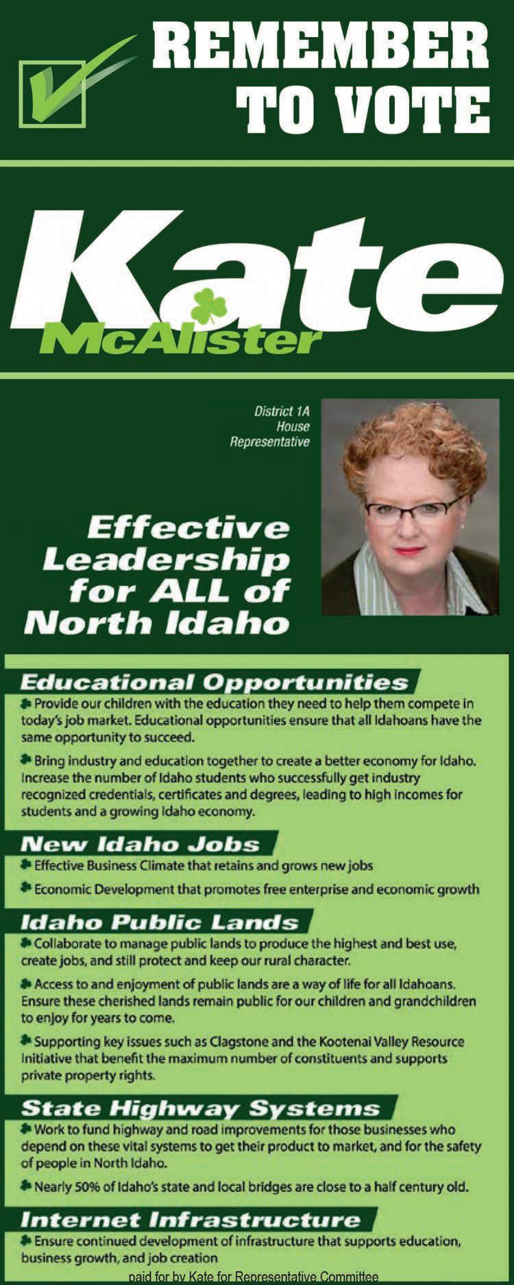 Locally, I support Kate McAlister in the State Representative District 1A race. I’ve known Kate for years and she has always impressed me with her professionalism, her humanity and her dedication to the community. Her opponent, Rep. Heather Scott, has continually proven that she is only interested in catering to those on the far right who support her. I disagreed with her decision to show up (during legislative session) to the Malheur incident in Oregon, where armed militants had taken over a federal building. I disapproved of her posing happily with a Confederate Flag. I am discouraged by her negative voting record in the legislature and her battle to win over the American Redoubt, which is a minority of far right wing advocates whose goal is to isolate themselves from the rest of the world’s problems. The only legislation that Scott promoted were ineffective bills, one of which even called for strengthening the rights of poachers. Also, Scott has continually ducked forums and appearances in front of her voting public in the interest of ducking her head in the sand until after the election. I think those running for office should always make themselves available to all of their constituents, period. They represent all of us, not just some of us.