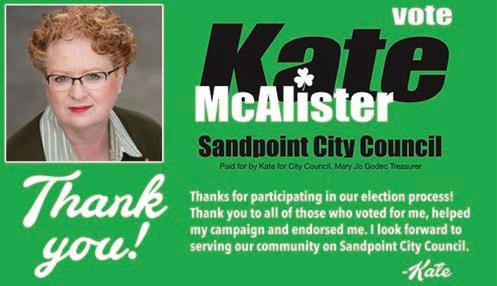 THANK YOU. THANK YOU. I am overwhelmed by your votes and belief in me. I cannot thank you enough. I promise to always do my best for all of us. But I need your help as well. I will reach out through my Kate for Sandpoint Facebook to keep you all apprised of what is happening and when I need your involvement. This is OUR community and together we will be even stronger. I am honored to serve you. Here we go!”