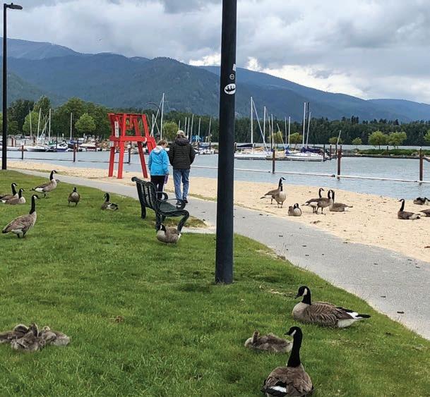 A couple walks through Sandpoint City Beach surrounded by Canada Geese in 2020. Photo by Jane Fritz.