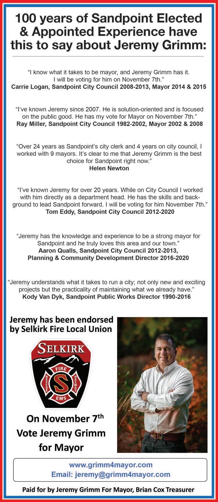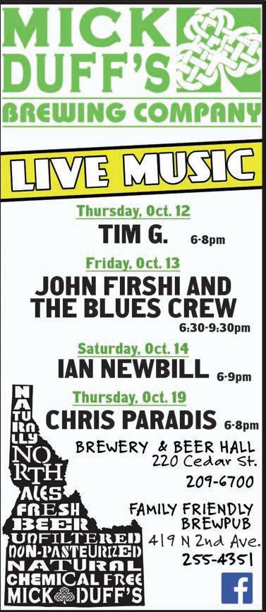 I have a couple of notes for you this week. First, don’t forget to attend the candidates’ forum sponsored by the Reader, KRFY 88.5 FM and Sandpoint Online at 5:30 p.m. on Tuesday, Oct. 17 at Sandpoint Community Hall. Candidates have been invited from the following races: Sandpoint mayor, Sandpoint City Council and LPOSD trustee. If you can’t make it to the event, tune in on 88.5 FM or stream it on KRFY. org. See Pages 16-21 for our candidate questionnaire, which includes the abovementioned candidates plus those from the WBCSD race.