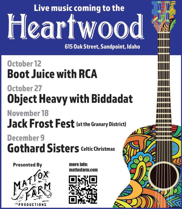 7:30-10 p.m.; $20 adults, $8 kids 6-17. The Heartwood Center, 615 Oak St, 208-263-8699, mattoxfarm.com. Listen at bootjuicejams.com.