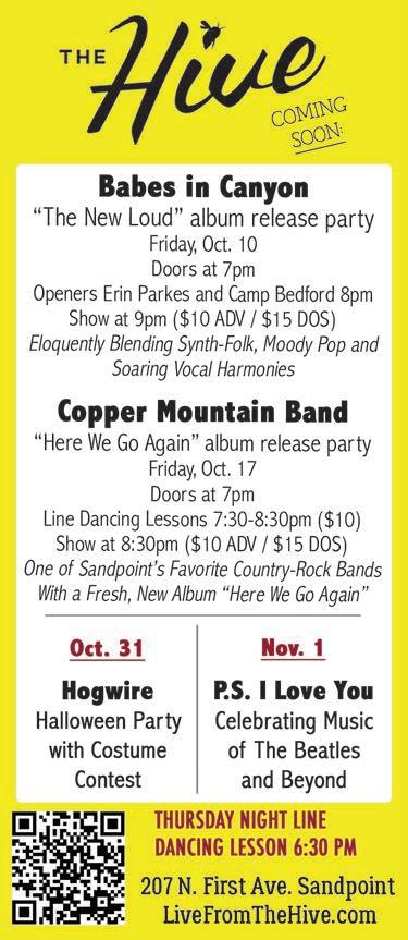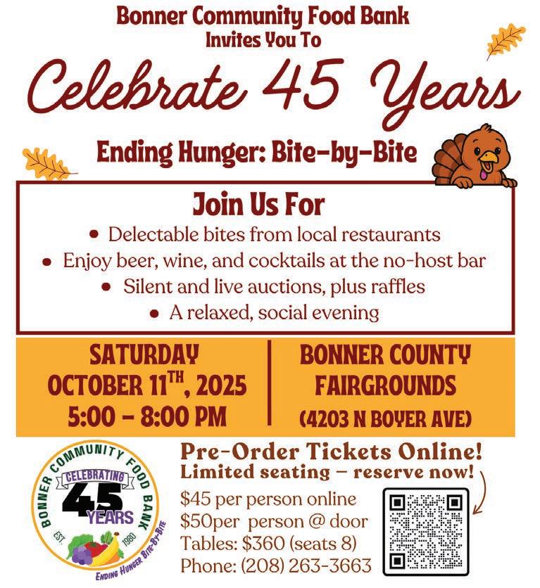 There are a lot of great events on the calendar this week. Bonner Community Food Bank is hosting a 45th anniversary fundraiser and I encourage anyone who is able to support this organization (see Page 16). Sandpoint Oktoberfest is back for its third year at the Granary Arts District (see Page 17) and music lovers will find a wide assortment of concerts to choose from. See the calendar on Page 18 for a full list of events.