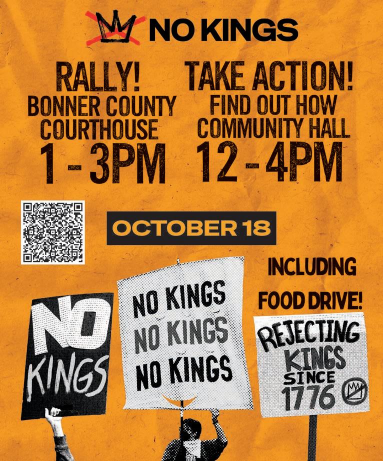 The Sandpoint “No Kings” rally will take place from 1-3 p.m. in front of the Community Hall (204 S. First Ave.). Materials will be available inside for participants to make their own signs.