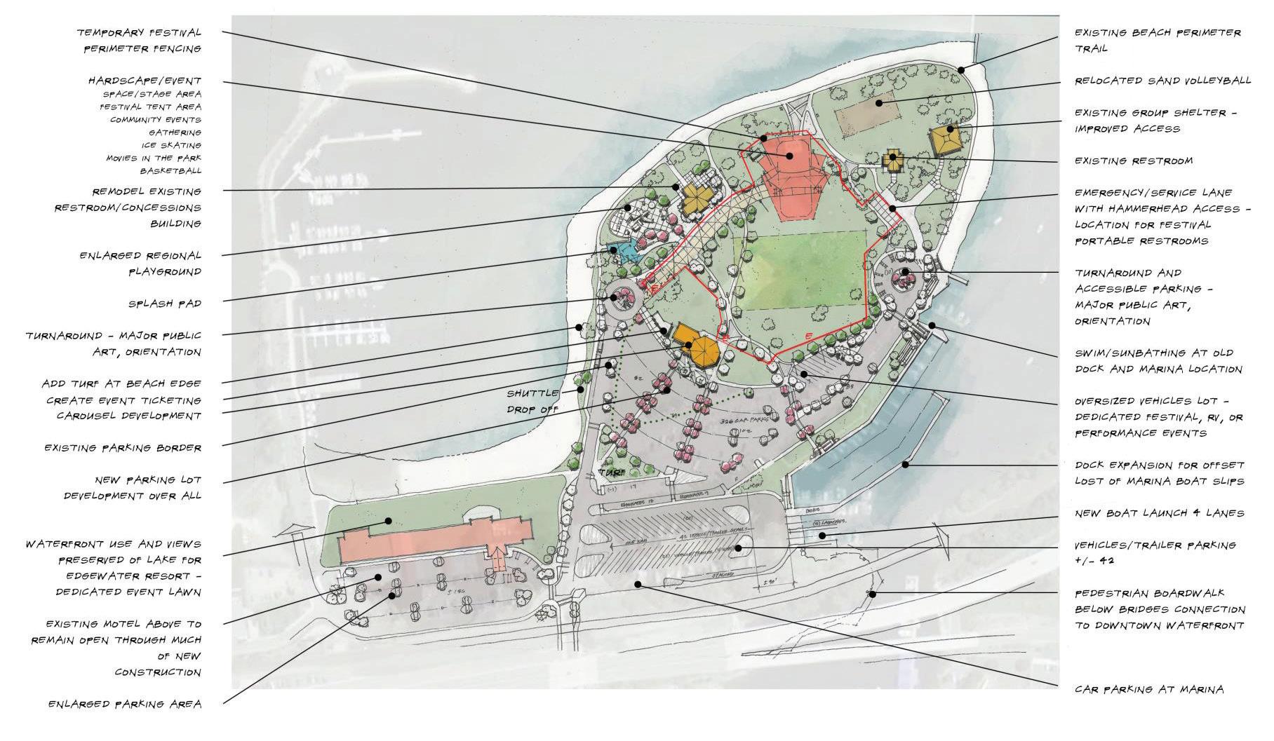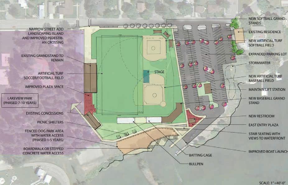 As presented by GreenPlay, the Memorial Field concept includes a combination soccer/ football/lacrosse field as well as new baseball and softball fields — all with synthetic turf and overlapping one another at various points. The parking lot would also be increased in size and boat launch area altered to include a boardwalk or stepped concrete water access. Other elements include a new restroom and east entry plaza, new softball grandstands, a batting cage and bullpen.