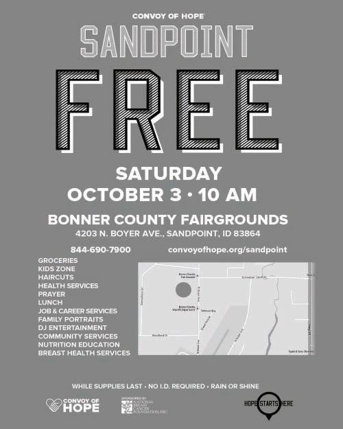 Also, check out the Convoy of Hope at the Bonner County Fairgrounds on Saturday, Oct. 3. It’s a free event for the community featuring free goods and services that support local businesses, churches, organizations and individuals.