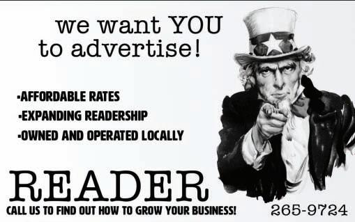 The Reader is printed on recycled paper using soy-based ink. Leftover copies are collected and recycled weekly, or burned in massive bonfires to appease the gods of journalism. Free to all, limit two copies per person.