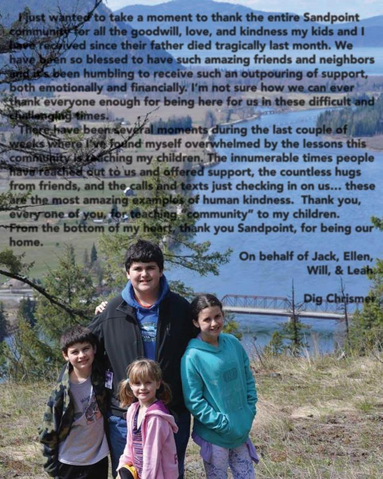 There have been several moments during the last couple of weeks where I’ve found myself overwhelmed by the lessons this community is teaching my children. The innumerable times people have reached out to us and offered support, the countless hugs from friends, and the calls and texts just checking in on us… these are the most amazing examples of human kindness. Thank you, every one of you, for teaching “community” to my children. F From the bottom of my heart, thank you Sandpoint, for being our home.