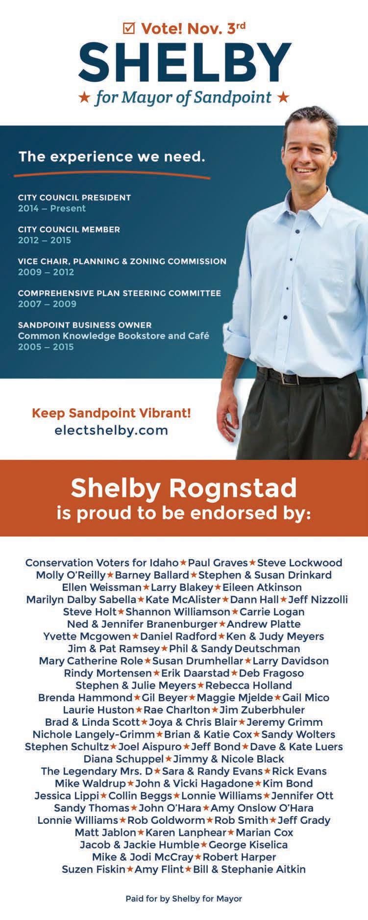 Shelby Rognstad is running for mayor of Sandpoint. Since the previous mayoral election, he has continued on City Council and was elected president by his fellow councilors. He has been deeply involved, spending many hundreds of hours involved in most aspects of City government. Because it runs smoothly, we tend to take police and fire protection for granted, use safe drinking water and flush toilets, use roadways